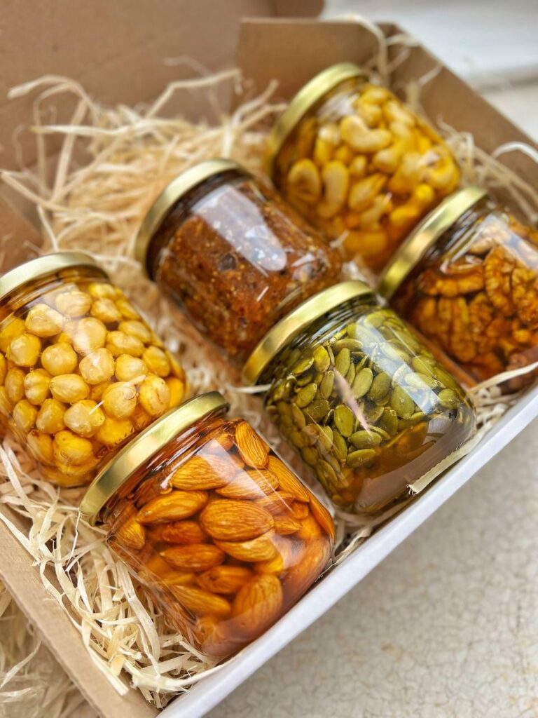 Шість баночок натурального меду з найкращими горішками, створені, щоб дарувати користь і насолоду: